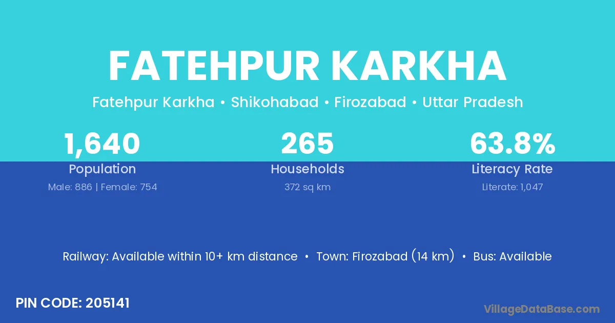 Firozabad (14 km) is the nearest town to Fatehpur Karkha village for major economic activities and is located approximately 14 km away.