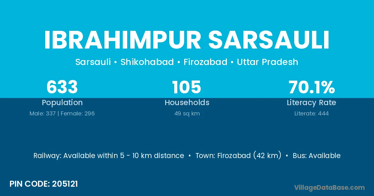 Firozabad (42 km) is the nearest town to Ibrahimpur Sarsauli village for major economic activities and is located approximately 42 km away.