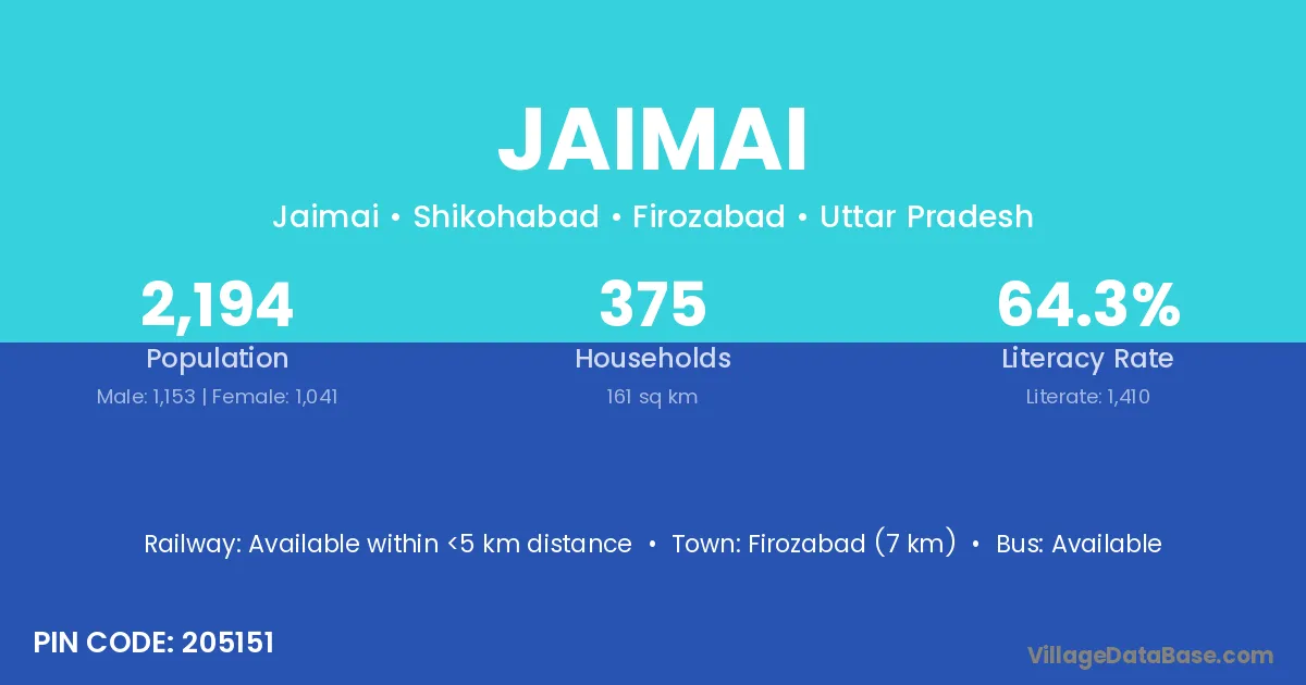 Firozabad (7 km) is the nearest town to Jaimai village for major economic activities and is located approximately 7 km away.
