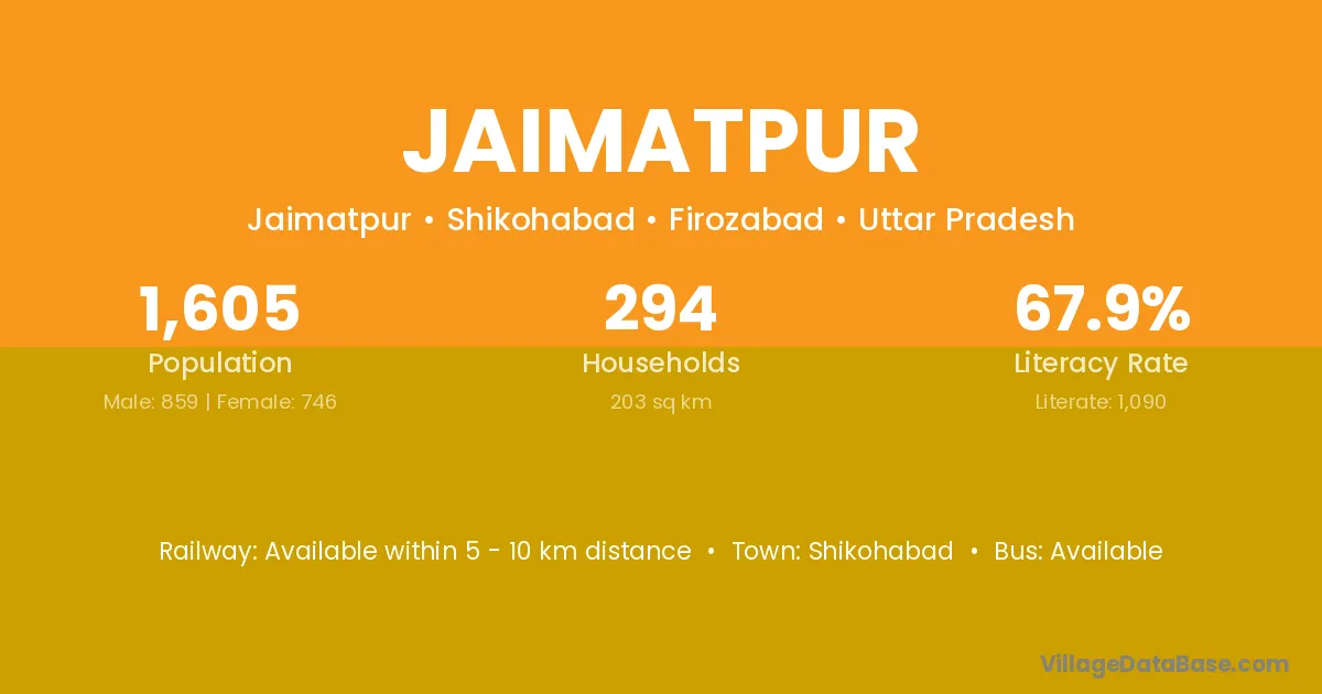 Shikohabad is the nearest town to Jaimatpur village for major economic activities