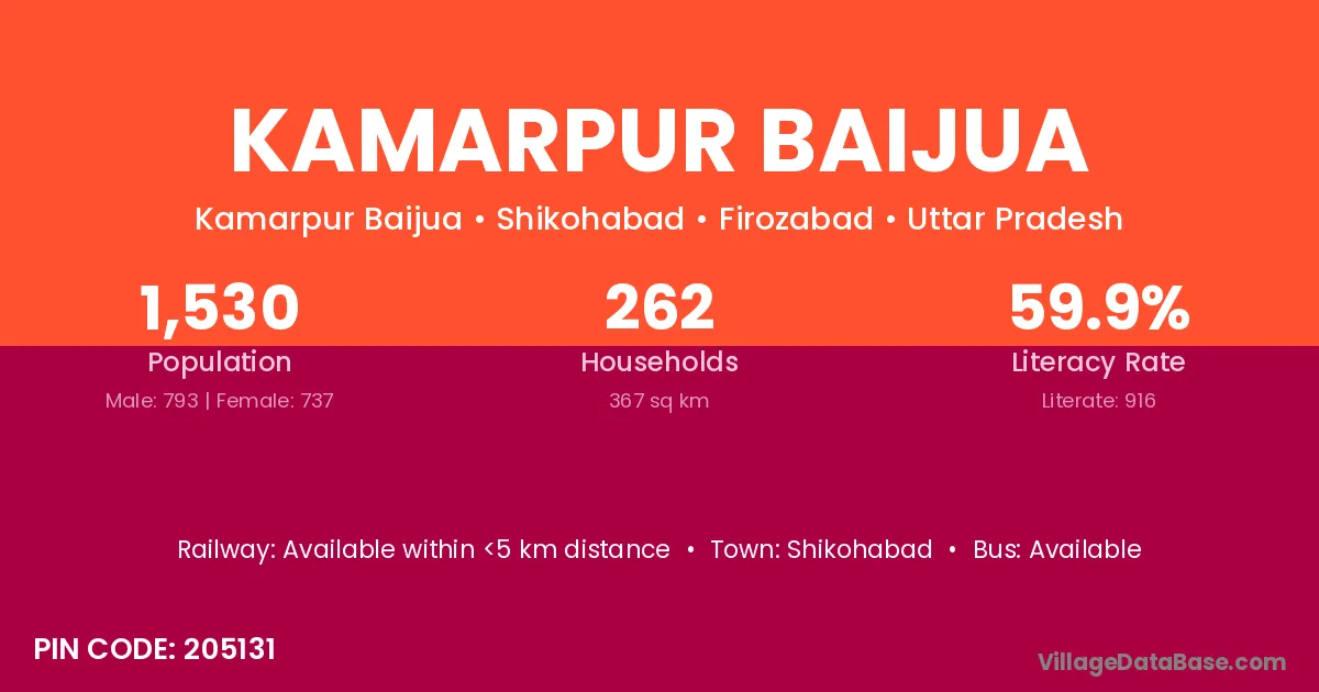Shikohabad is the nearest town to Kamarpur Baijua village for major economic activities