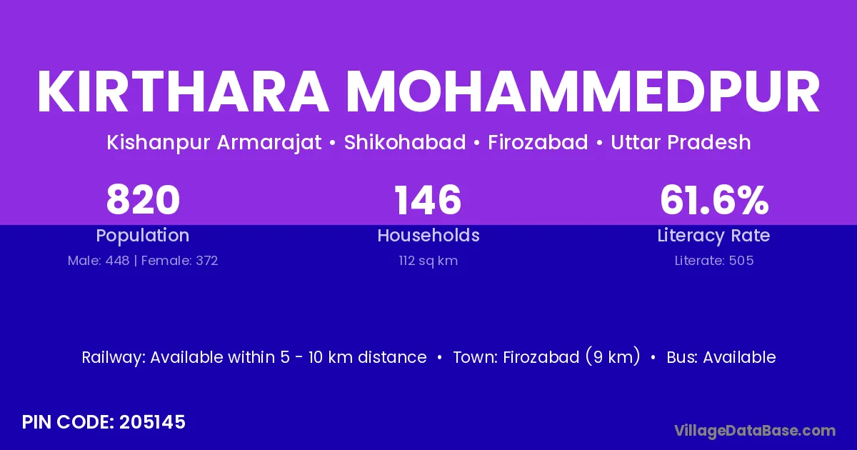 Firozabad (9 km) is the nearest town to Kirthara Mohammedpur village for major economic activities and is located approximately 9 km away.