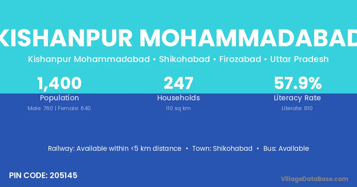 Shikohabad is the nearest town to Kishanpur Mohammadabad village for major economic activities
