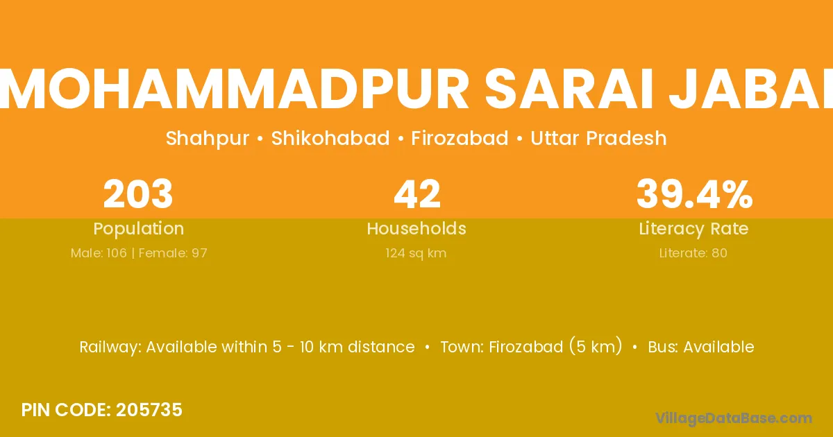 Firozabad (5 km) is the nearest town to Mohammadpur Sarai Jabai village for major economic activities and is located approximately 5 km away.