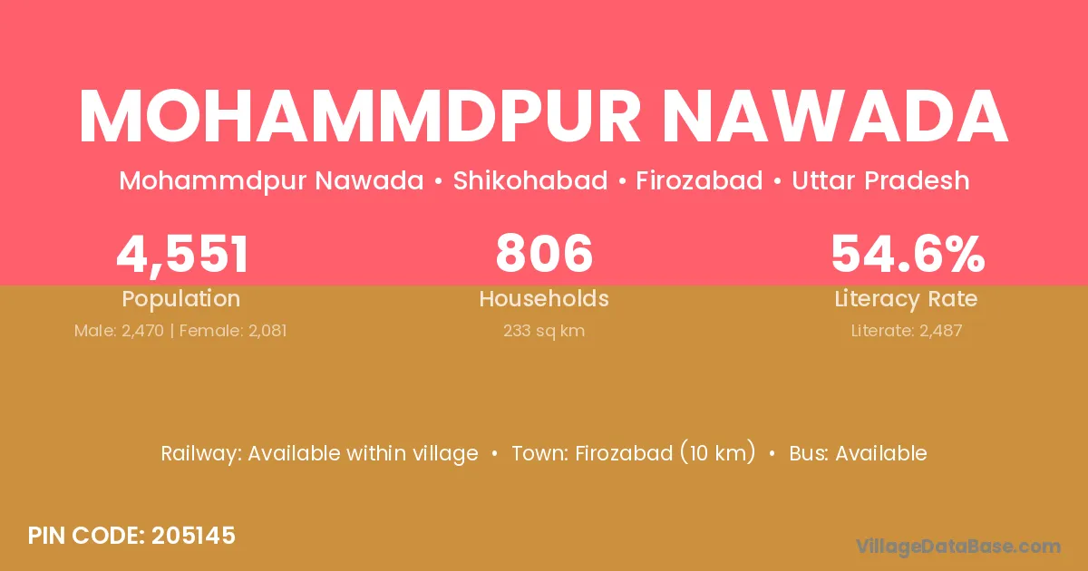 Firozabad (10 km) is the nearest town to Mohammdpur Nawada village for major economic activities and is located approximately 10 km away.