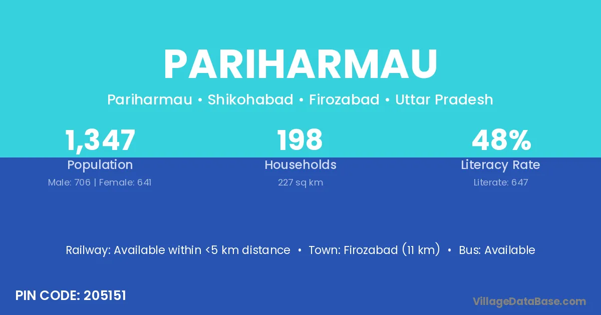 Firozabad (11 km) is the nearest town to Pariharmau village for major economic activities and is located approximately 11 km away.