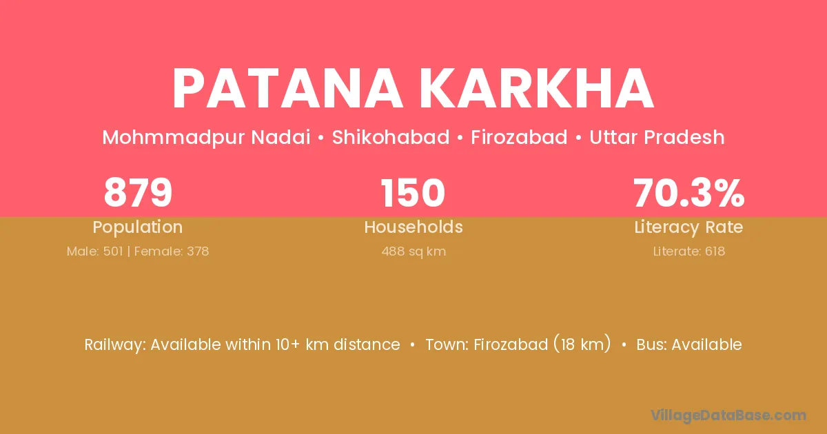Firozabad (18 km) is the nearest town to Patana Karkha village for major economic activities and is located approximately 18 km away.