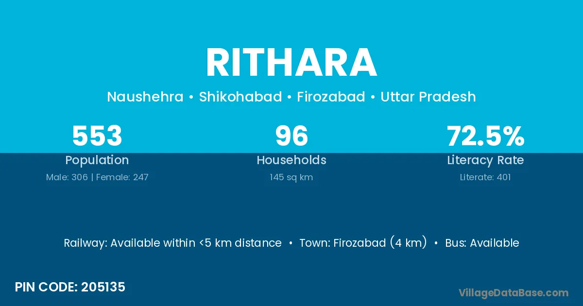 Firozabad (4 km) is the nearest town to Rithara village for major economic activities and is located approximately 4 km away.