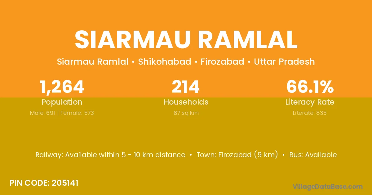 Firozabad (9 km) is the nearest town to Siarmau Ramlal village for major economic activities and is located approximately 9 km away.