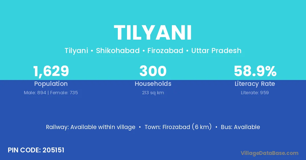 Firozabad (6 km) is the nearest town to Tilyani village for major economic activities and is located approximately 6 km away.