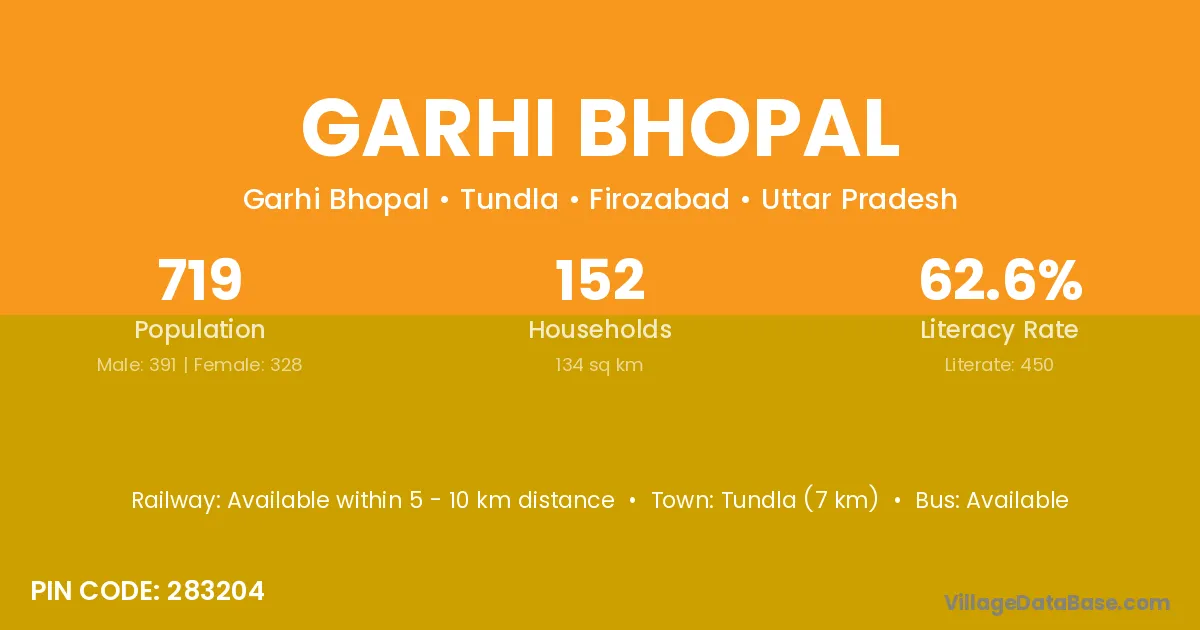Tundla (7 km) is the nearest town to Garhi Bhopal village for major economic activities and is located approximately 7 km away.