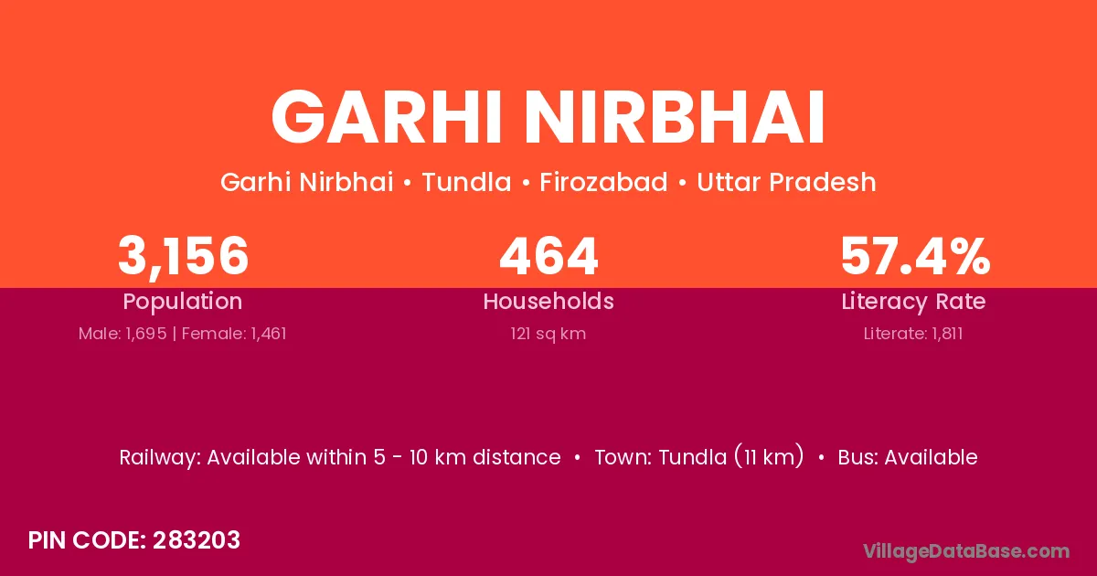 Tundla (11 km) is the nearest town to Garhi Nirbhai village for major economic activities and is located approximately 11 km away.
