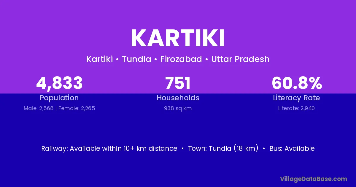 Tundla (18 km) is the nearest town to Kartiki village for major economic activities and is located approximately 18 km away.