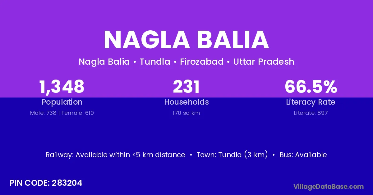 Tundla (3 km) is the nearest town to Nagla Balia village for major economic activities and is located approximately 3 km away.
