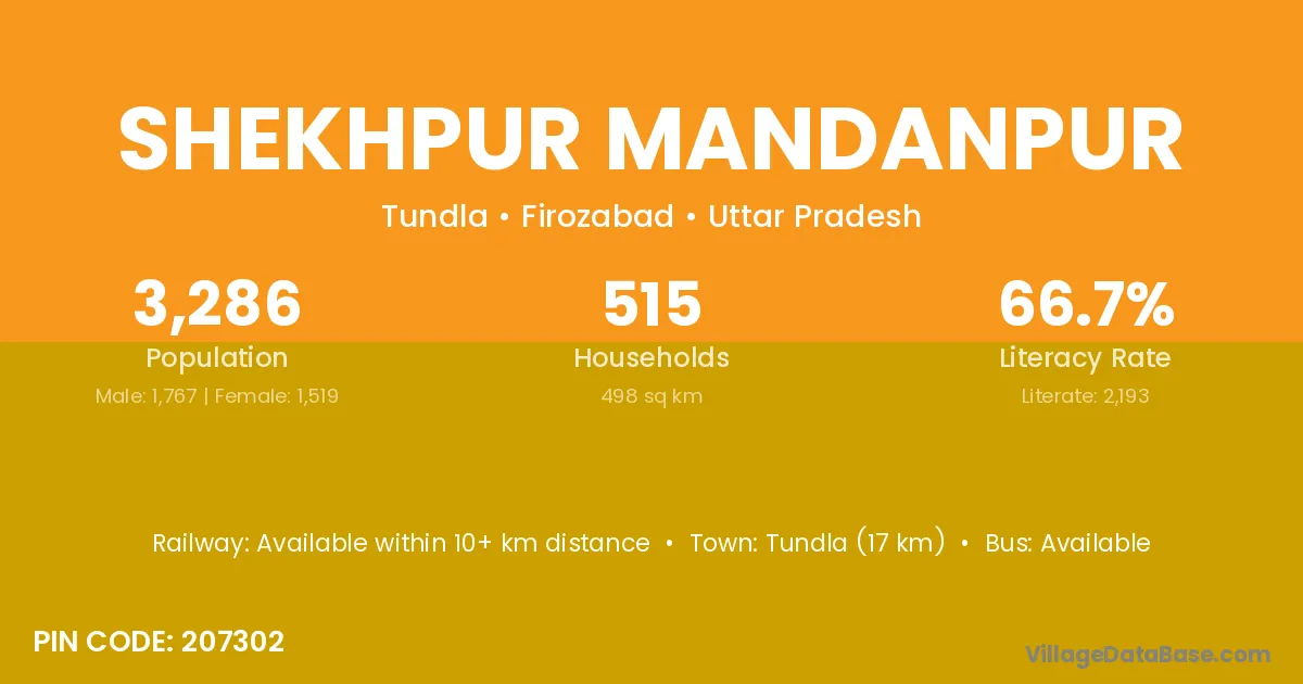 Tundla (17 km) is the nearest town to Shekhpur Mandanpur village for major economic activities and is located approximately 17 km away.