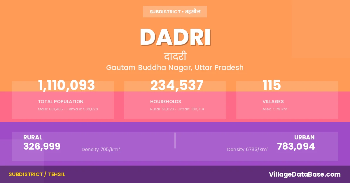 According to the 2011 census The total area of Dadri Tehsil is 579 km², with a population of 1110093 people. The population density is 1,917 inhabitants per square kilometre, and there are approximately 234537 houses in the sub district.