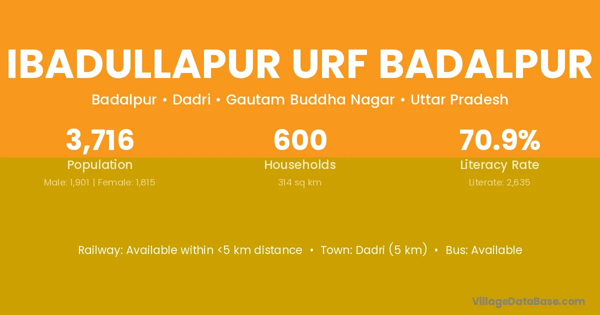 Dadri (5 km) is the nearest town to Ibadullapur Urf Badalpur village for major economic activities and is located approximately 5 km away.