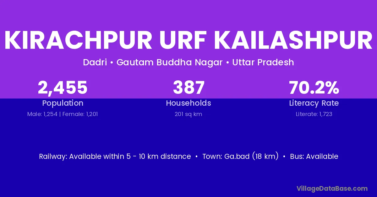 Kirachpur Urf Kailashpur village has a total population of 2,455 people, of which 1,254 are males and 1,201 are females.