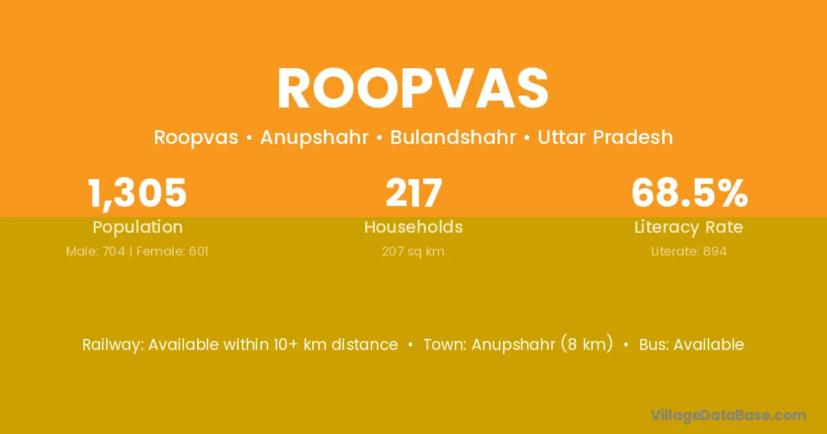 The literacy rate of Roopvas village is 62.75%. Male literacy stands at 69.44% and female literacy at 54.99%.