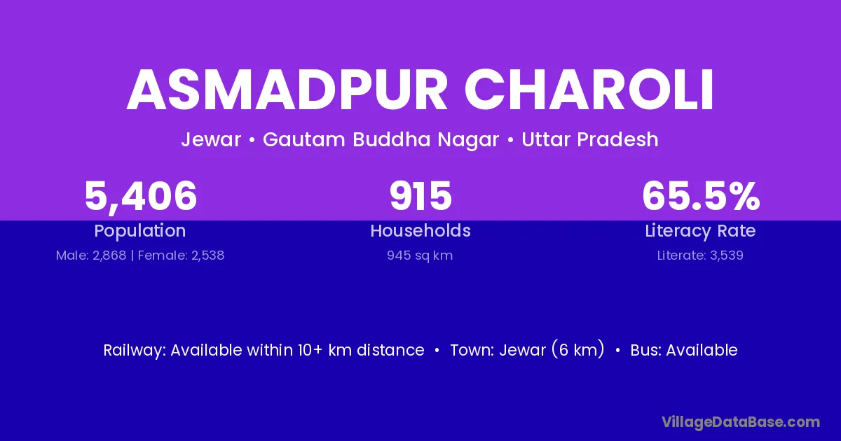 Jewar (6 km) is the nearest town to Asmadpur Charoli village for major economic activities and is located approximately 6 km away.