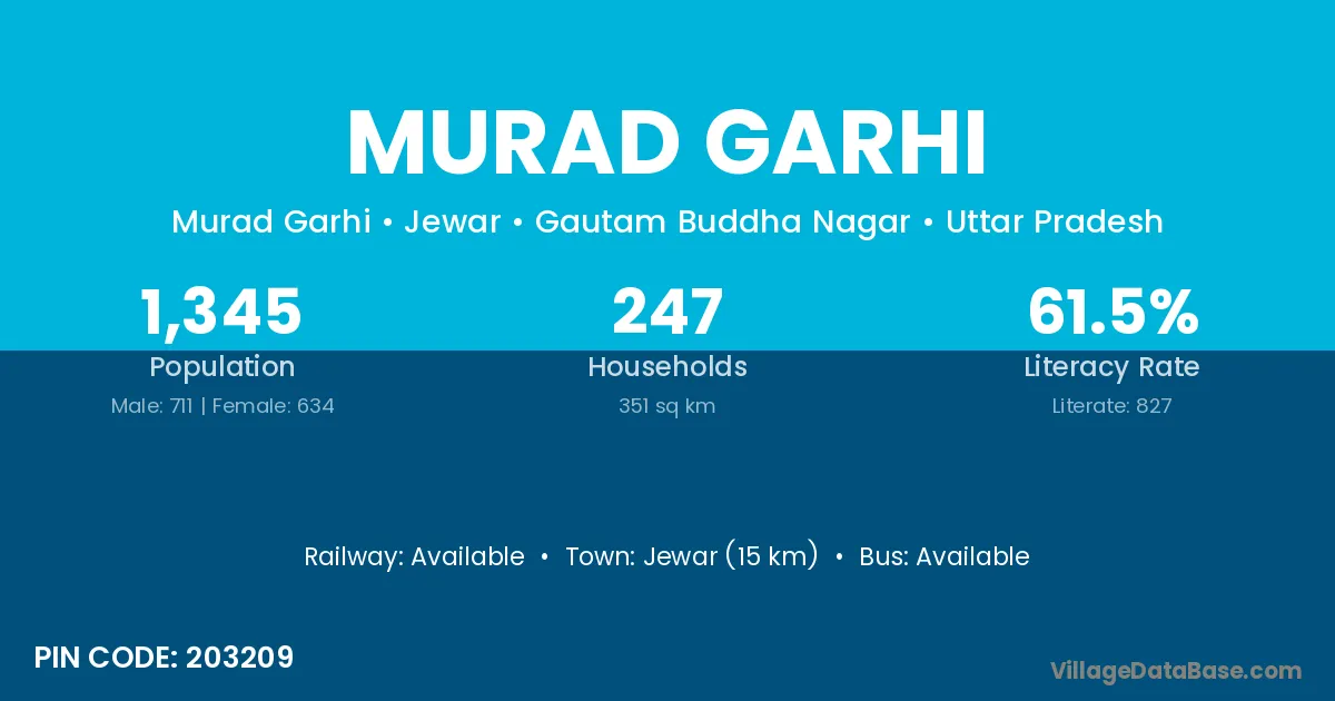 Jewar (15 km) is the nearest town to Murad Garhi village for major economic activities and is located approximately 15 km away.