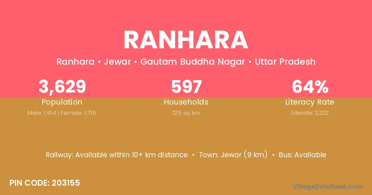 Jewar (9 km) is the nearest town to Ranhara village for major economic activities and is located approximately 9 km away.