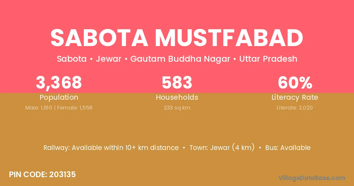 Jewar (4 km) is the nearest town to Sabota Mustfabad village for major economic activities and is located approximately 4 km away.