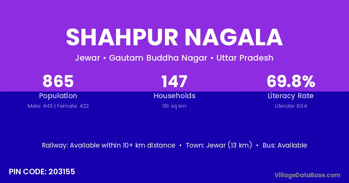 Jewar (13 km) is the nearest town to Shahpur Nagala village for major economic activities and is located approximately 13 km away.