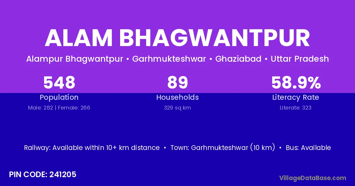 Garhmukteshwar (10 km) is the nearest town to Alam Bhagwantpur village for major economic activities and is located approximately 10 km away.