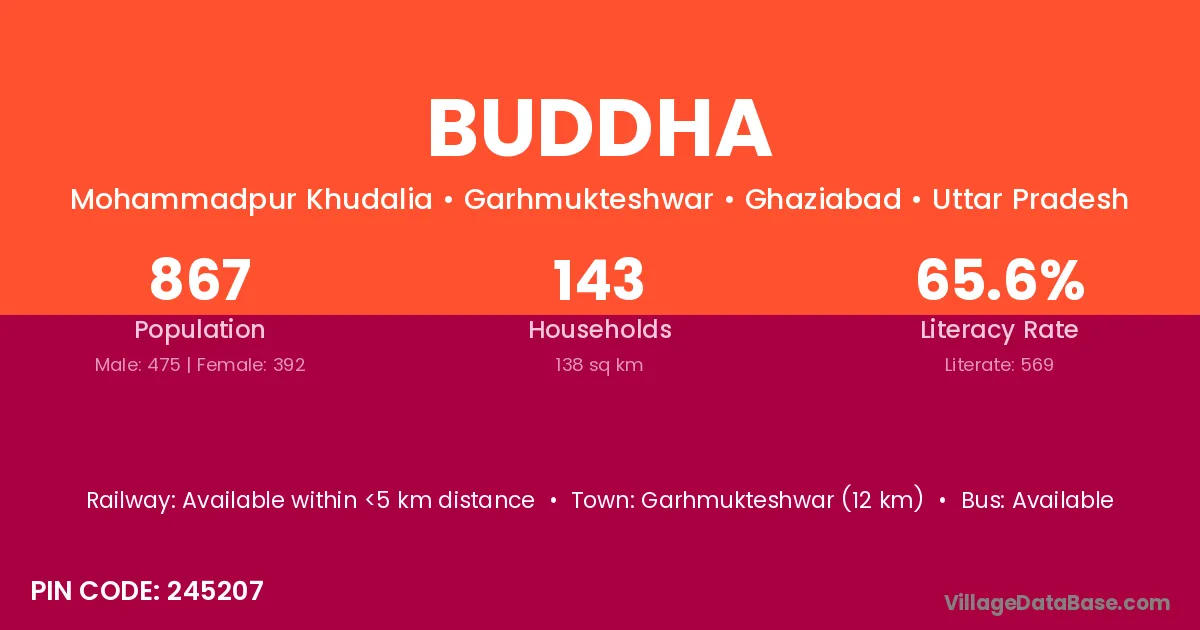 Garhmukteshwar (12 km) is the nearest town to Buddha village for major economic activities and is located approximately 12 km away.