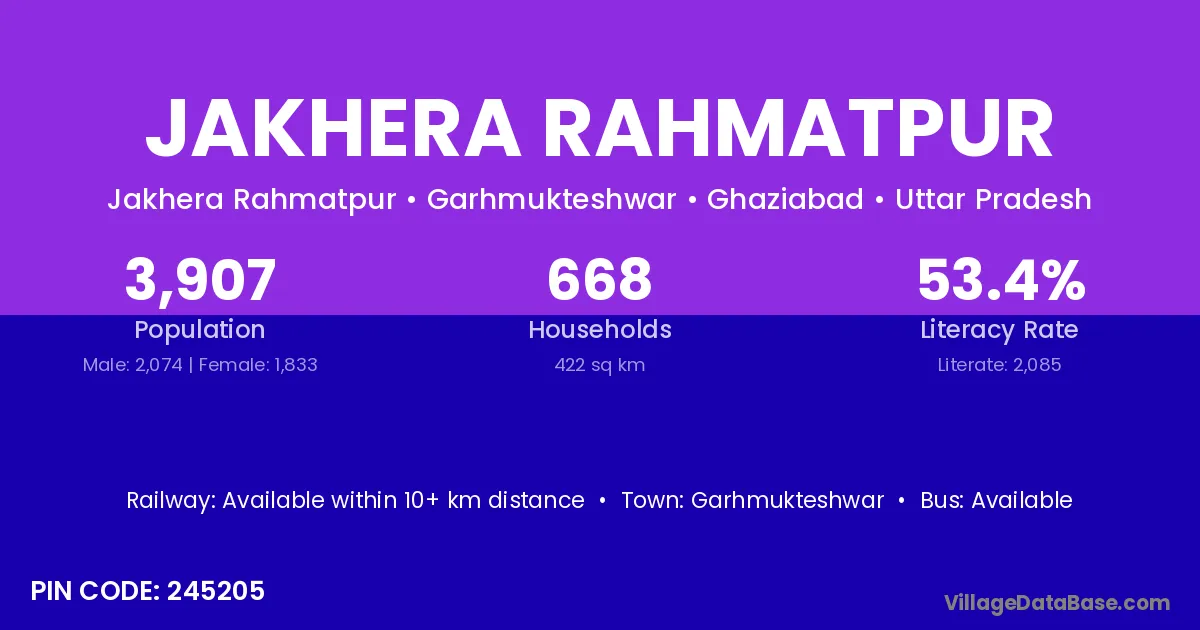 Jakhera Rahmatpur village has a total population of 3,907 people, of which 2,074 are males and 1,833 are females.