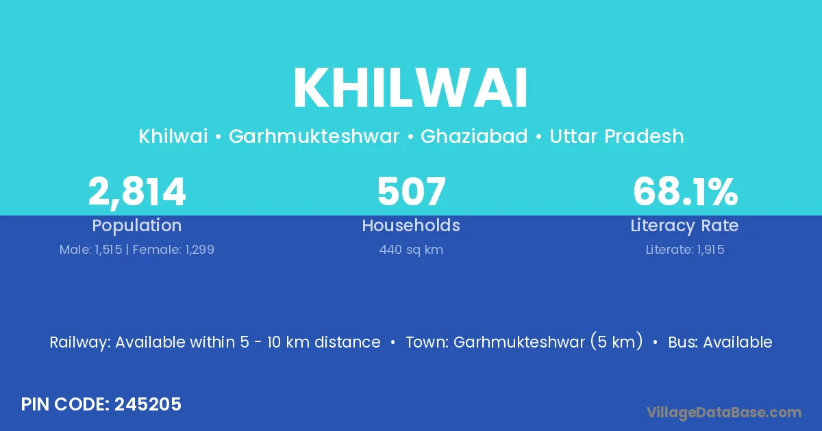 Garhmukteshwar (5 km) is the nearest town to Khilwai village for major economic activities and is located approximately 5 km away.