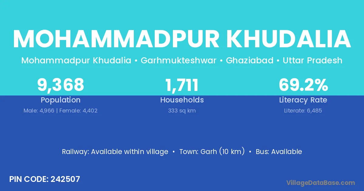 Mohammadpur Khudalia village has a total population of 9,368 people, of which 4,966 are males and 4,402 are females.