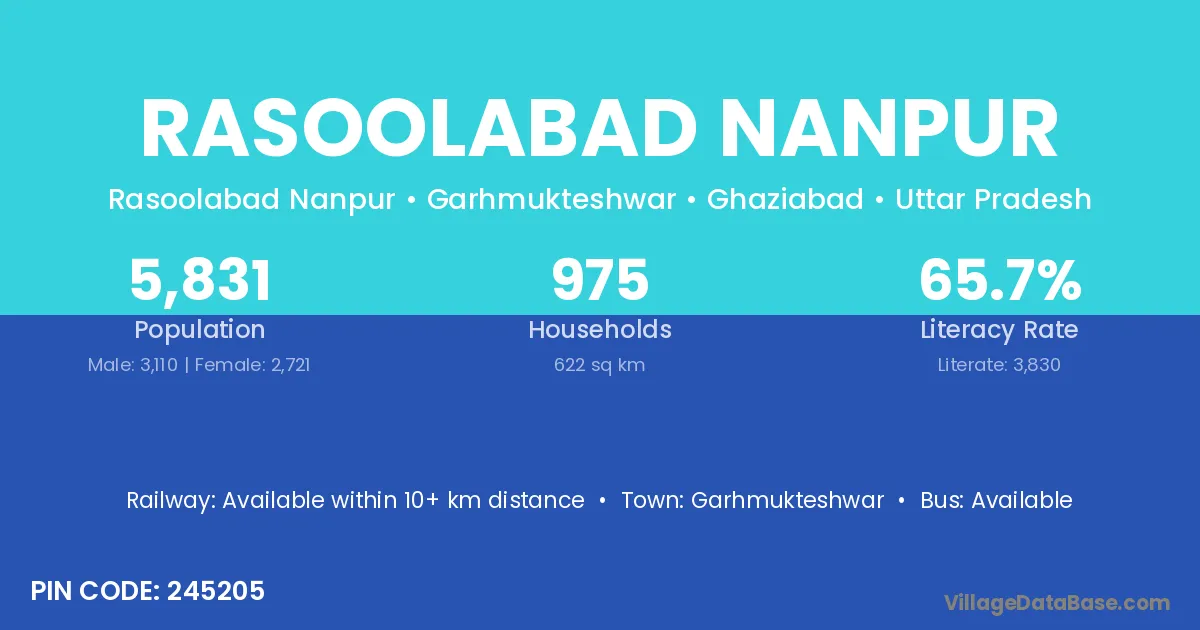 Rasoolabad Nanpur village has a total population of 5,831 people, of which 3,110 are males and 2,721 are females.