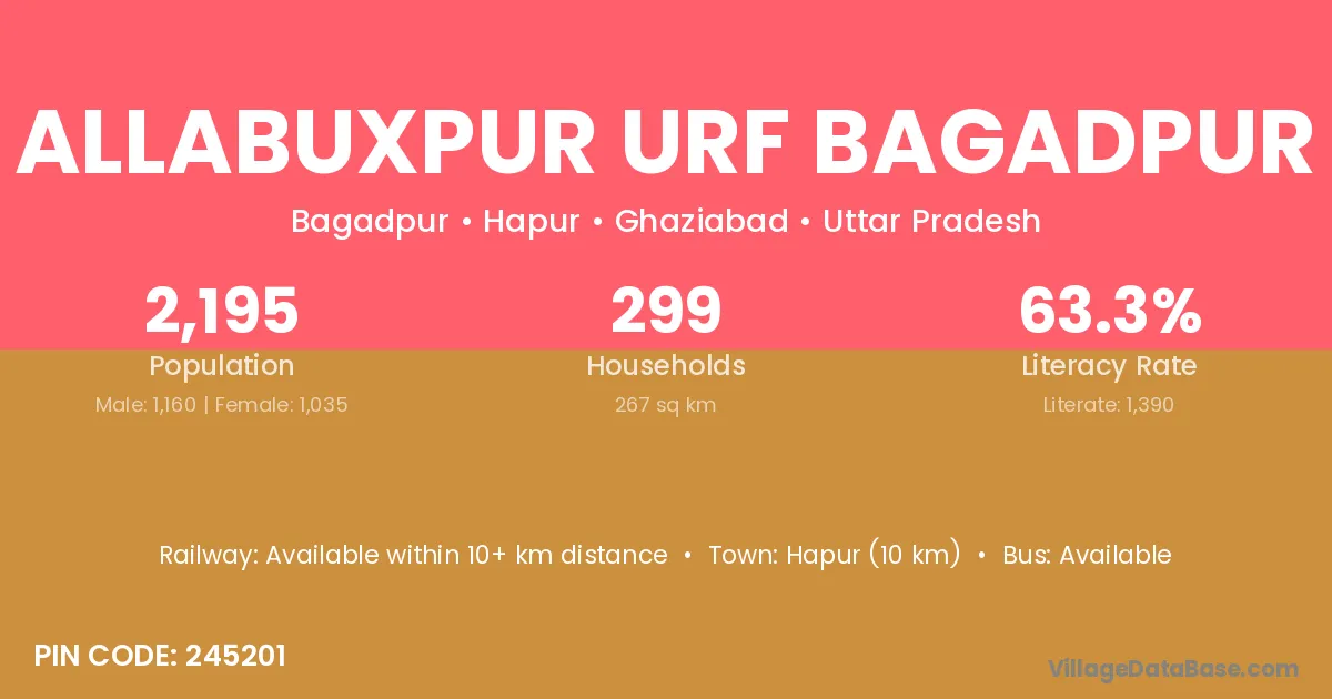 Allabuxpur Urf Bagadpur village has a total population of 2,195 people, of which 1,160 are males and 1,035 are females.