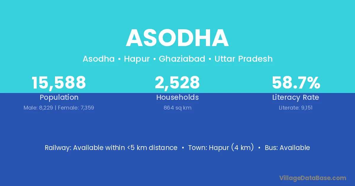 Asodha village has a total population of 15,588 people, of which 8,229 are males and 7,359 are females.