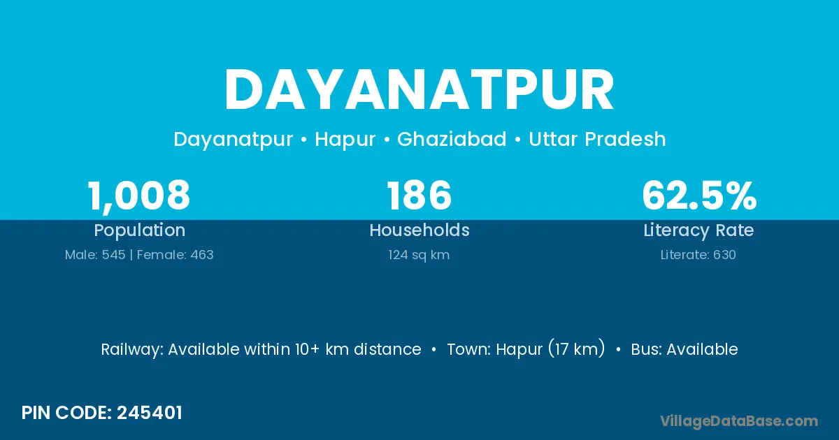Hapur (17 km) is the nearest town to Dayanatpur village for major economic activities and is located approximately 17 km away.
