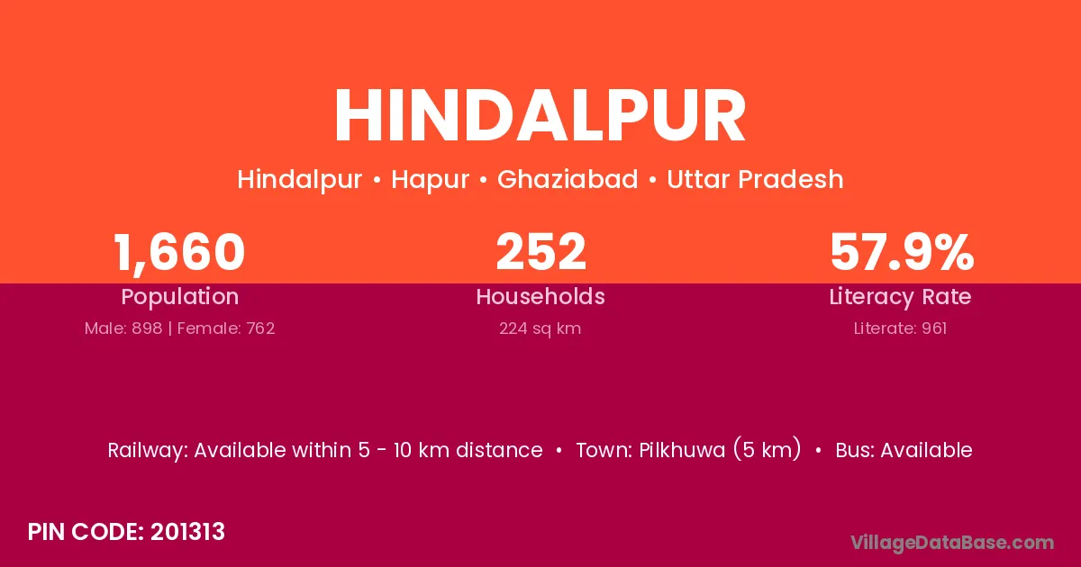 Pilkhuwa (5 km) is the nearest town to Hindalpur village for major economic activities and is located approximately 5 km away.