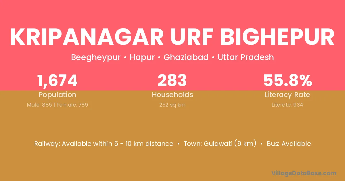 Kripanagar Urf Bighepur village has a total population of 1,674 people, of which 885 are males and 789 are females.