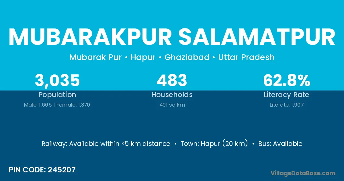 Hapur (20 km) is the nearest town to Mubarakpur Salamatpur village for major economic activities and is located approximately 20 km away.