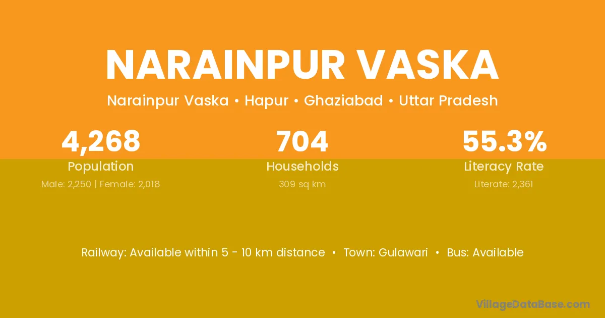 Narainpur Vaska village has a total population of 4,268 people, of which 2,250 are males and 2,018 are females.