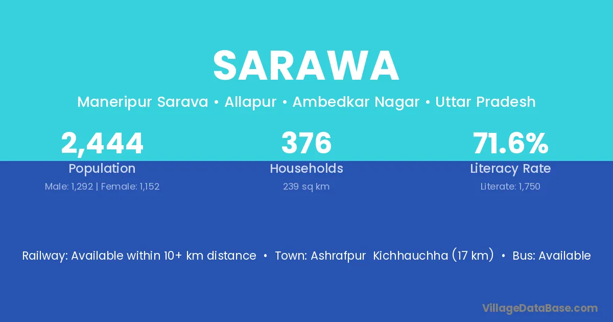 The literacy rate of Sarawa village is 53.92%. Male literacy stands at 63.15% and female literacy at 43.44%.