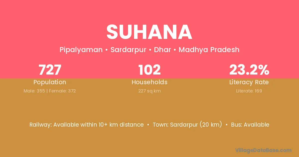 The literacy rate of Suhana village is 60.32%. Male literacy stands at 66.22% and female literacy at 53.66%.