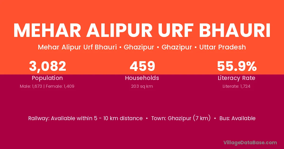 Ghazipur (7 km) is the nearest town to Mehar Alipur Urf Bhauri village for major economic activities and is located approximately 7 km away.