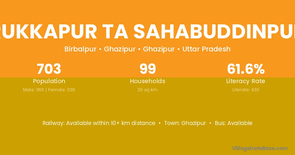 Rukkapur Ta Sahabuddinpur village has a total population of 703 people, of which 365 are males and 338 are females.