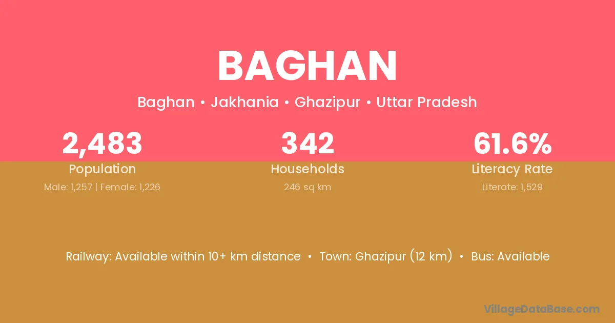 Ghazipur (12 km) is the nearest town to Baghan village for major economic activities and is located approximately 12 km away.