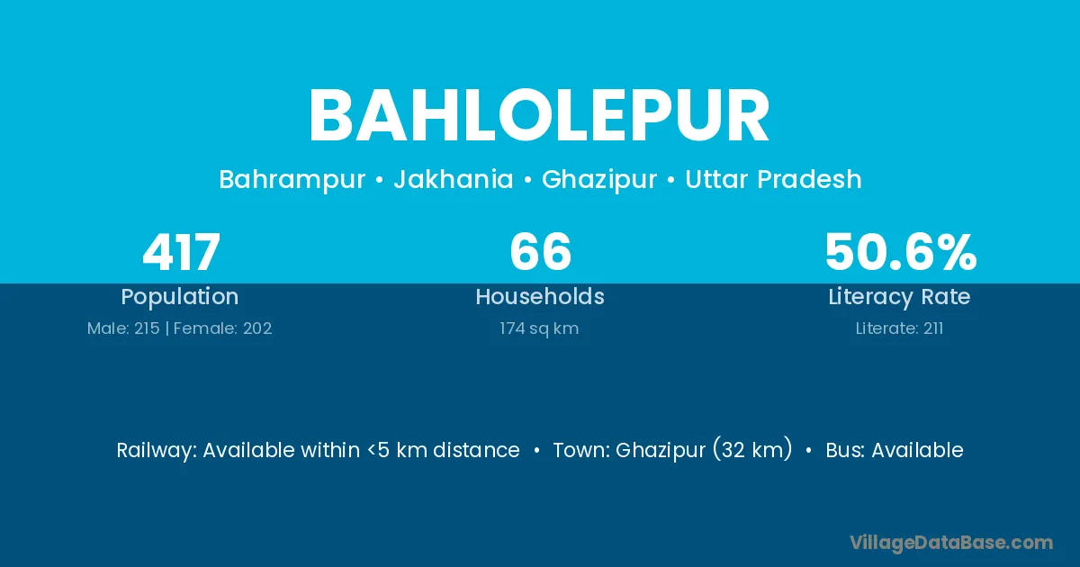 Ghazipur (32 km) is the nearest town to Bahlolepur village for major economic activities and is located approximately 32 km away.