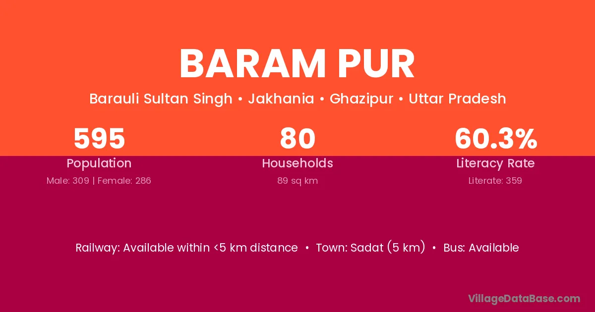 The literacy rate of Baram Pur village is 60.34%. Male literacy stands at 70.87% and female literacy at 48.95%.