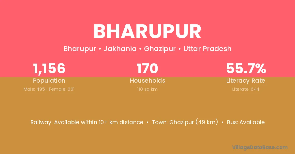 Ghazipur (49 km) is the nearest town to Bharupur village for major economic activities and is located approximately 49 km away.