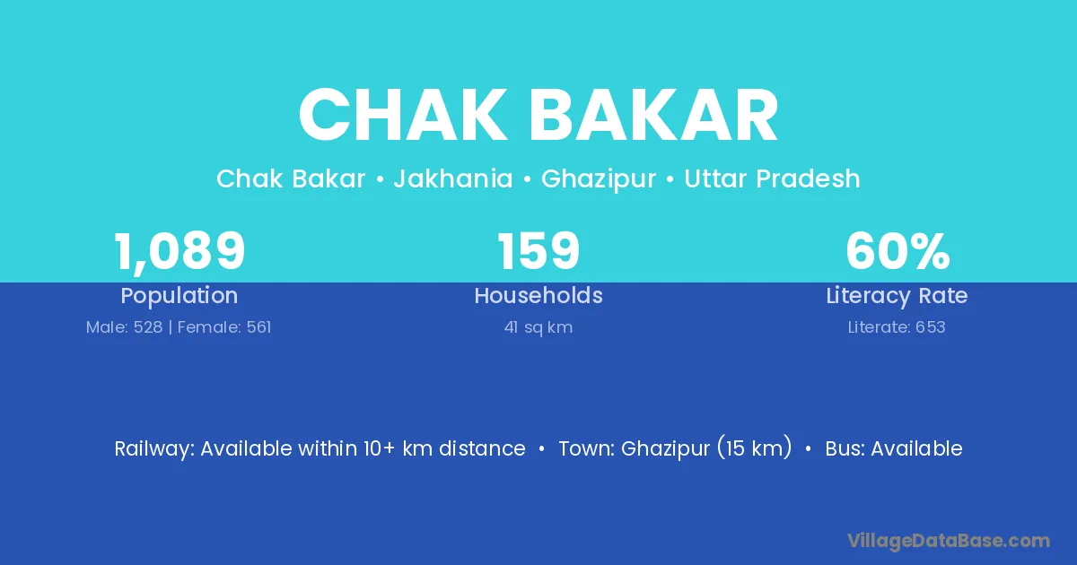 Ghazipur (15 km) is the nearest town to Chak Bakar village for major economic activities and is located approximately 15 km away.